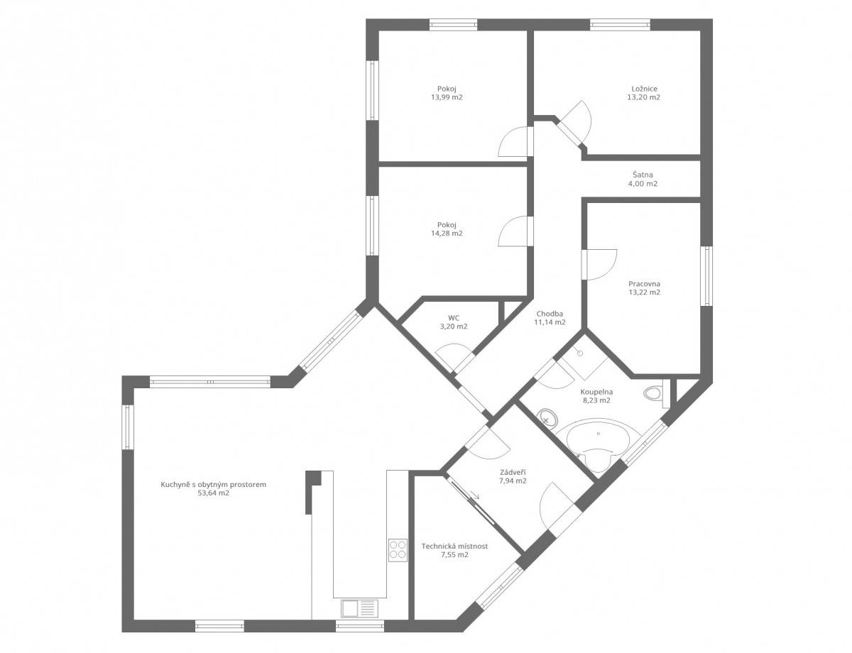Užitná plocha hlavní obytné místnosti činí zhruba 50 metrů čtverečních, což je podle majitelů více než dostačující.