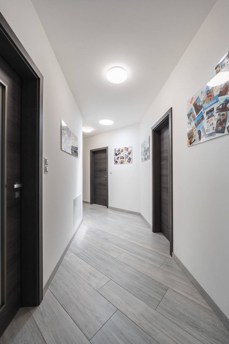 Za skleněnými posuvnými dveřmi se nachází dlouhá chodba se světlíkem, který dokonale prosvětlí celý prostor.