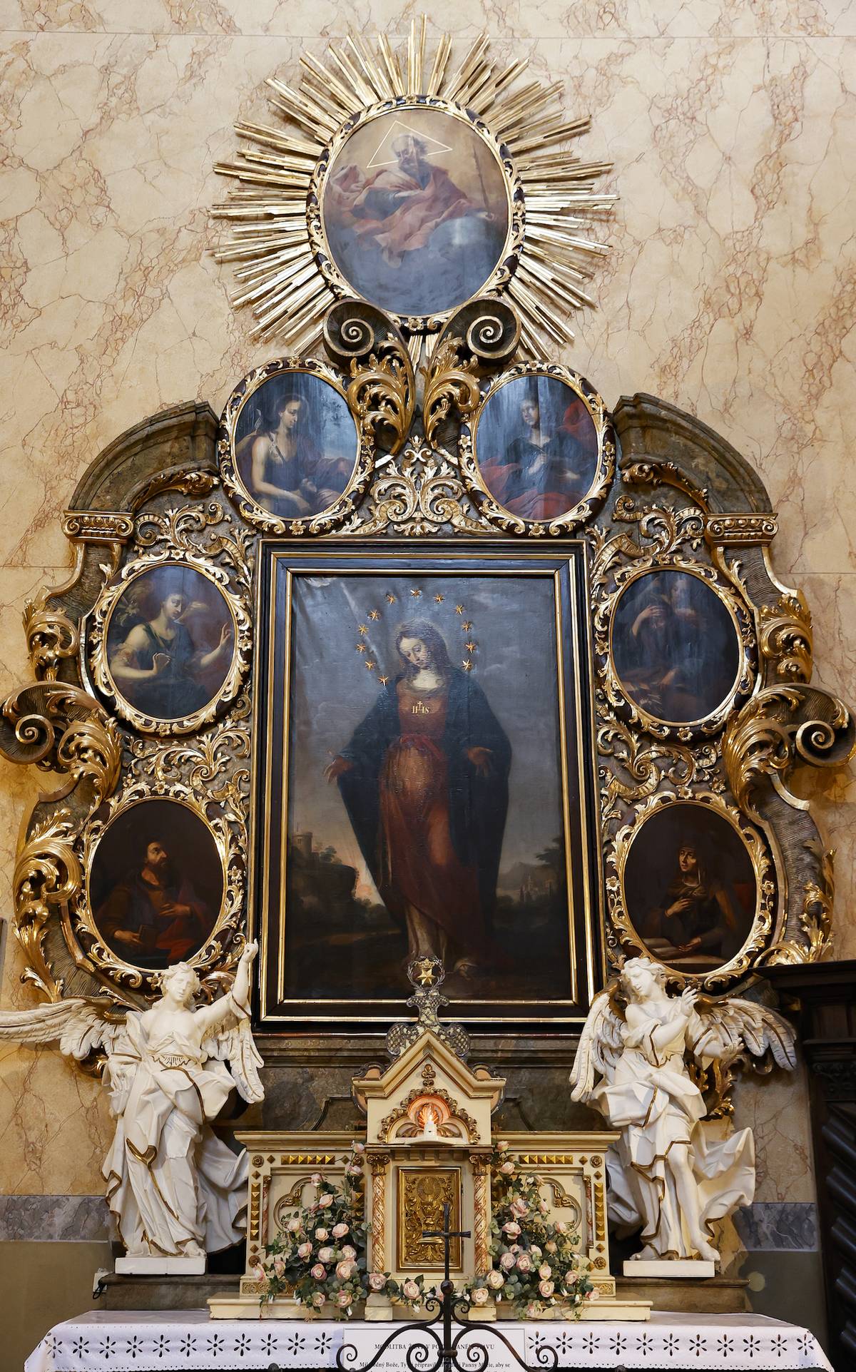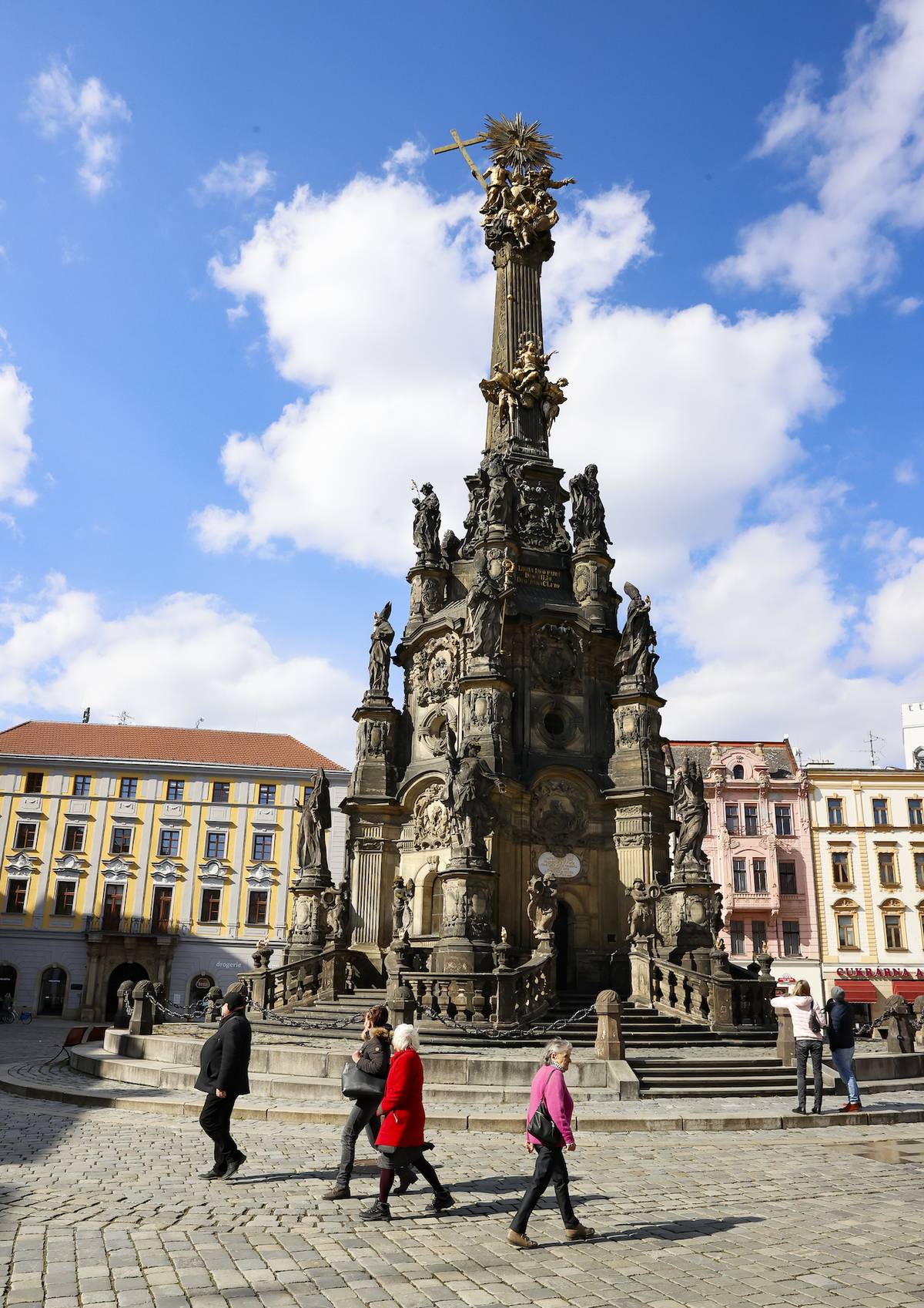 Průvodkyně Eva Kušová u Sloupu Nejsvětější Trojice, za dveřmi se ukrývá kaple.