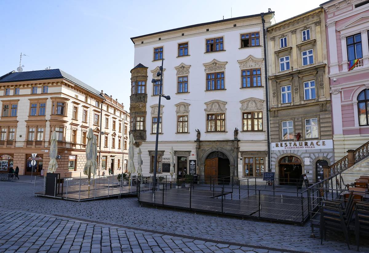 Bíle omítnutý dům je Hauenschildův palác, kde v době svého pobytu v Olomouci bydlel s rodiči a sestrou tehdy jedenáctiletý W. A. Mozart.