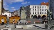 Dolní náměstí, vzadu Mariánský sloup, v popředí Neptunova kašna