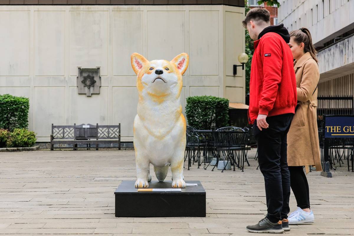 Socha corgiho v nadživotní velikosti uprostřed Londýna.