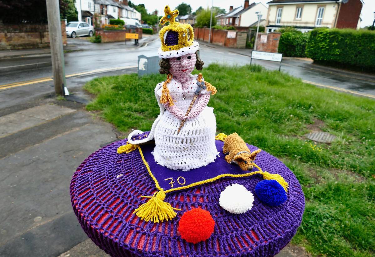 Malá háčkovaná královna a corgi zdobí poštovní schránky v Readingu.