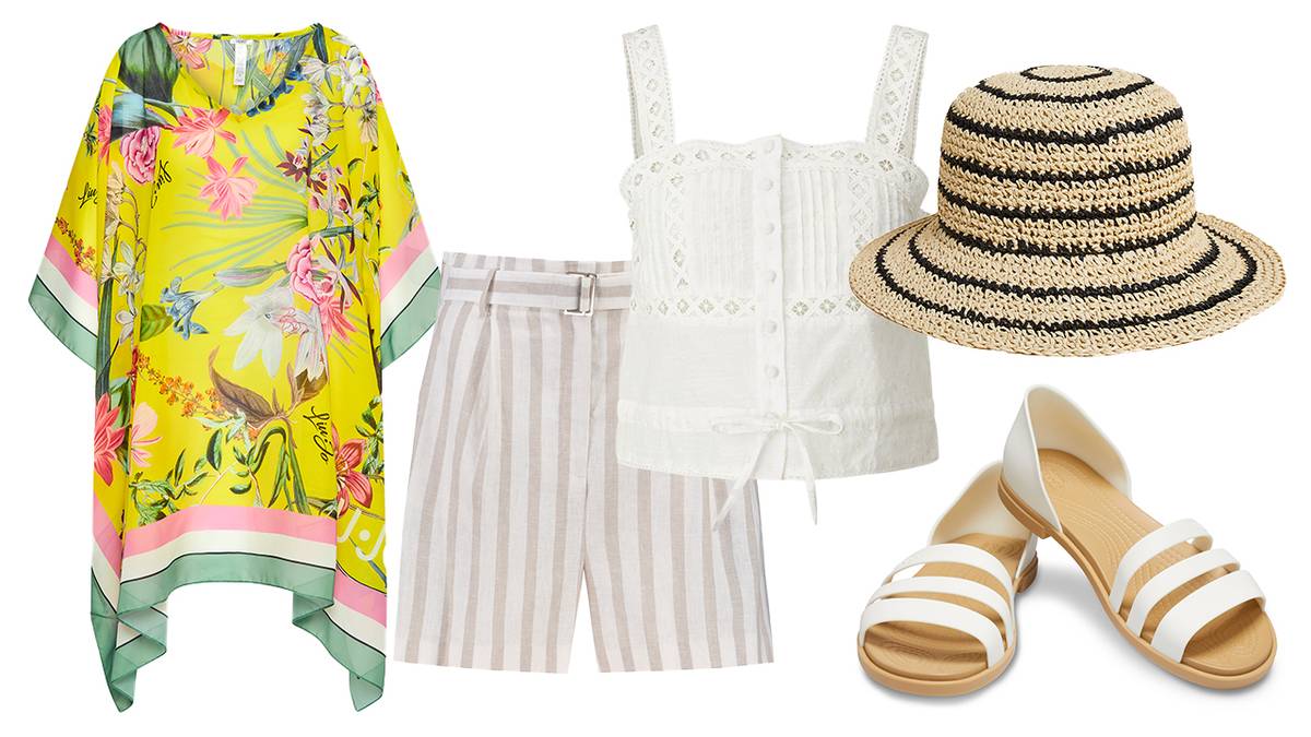 Kaftan, Liu Jo (prodává Modivo), 1790 Kč. Lněné šortky, F&F, 449 Kč. Top, s.Oliver, 999 Kč. Klobouček, Marks & Spencer, 599 Kč. Gumové sandály, Crocs (prodává Urbanlux), 1519 Kč