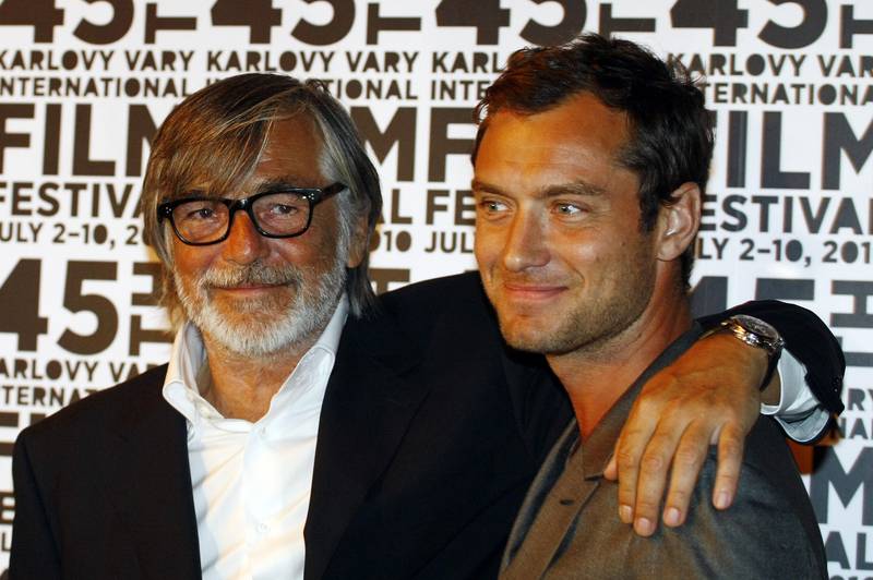 Herec Jude Law v objetí s prezidentem festivalu Jiřím Bartoškou.