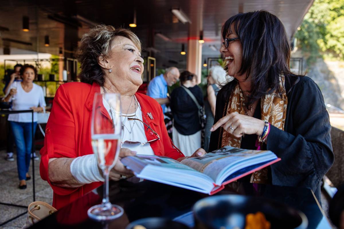 Tereza Brodská (vpravo) ukazuje svou knihu jedenadevadesátileté herečce Jiřině Bohdalové.