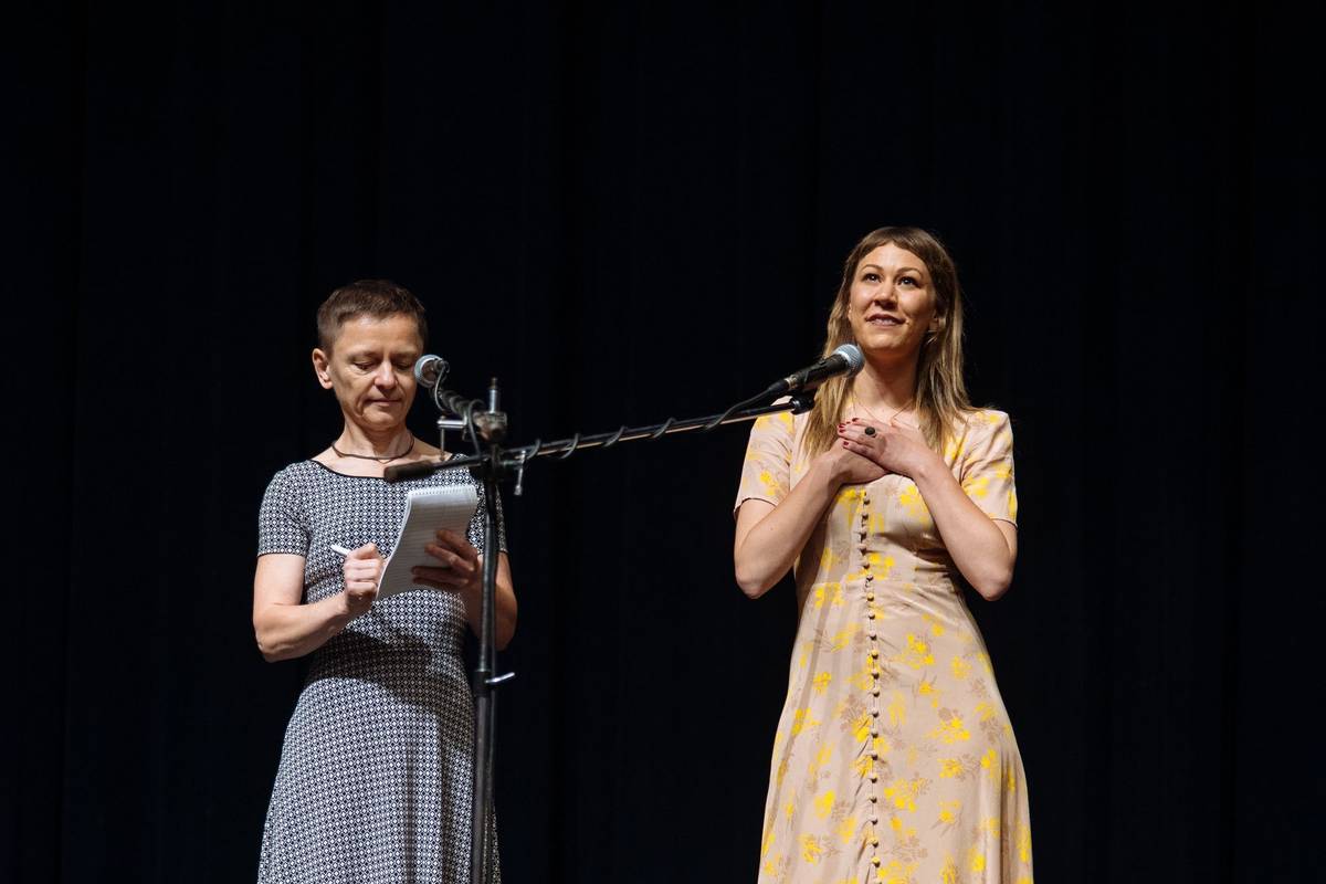 Tlumočnice Helena Koutná a Sara Dosaová, režisérka Erupcí lásky.