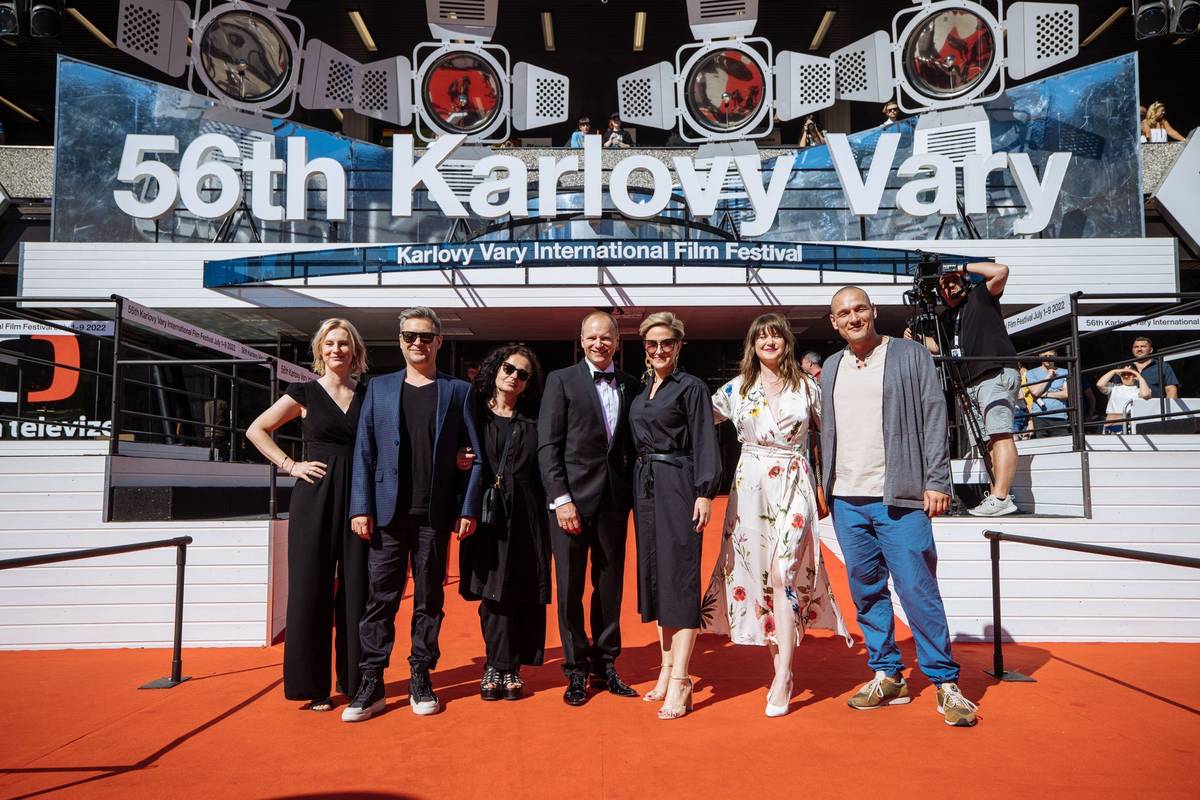 Delegace soutěžního filmu Fucking Bornholm o dvou rodinách, které tráví prodloužený květnový víkend v kempu na idylickém dánském ostrově. Zleva mluvčí Izabela Kiszka-Hoflik, výtvarník Marcel Sławiński, členka štábu Katarzyna Sobańska, herec Maciej Stuhr, režisérka Anna Kazejak, produkční Marta Lewandowska a scénárista Filip Kasperaszek.