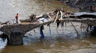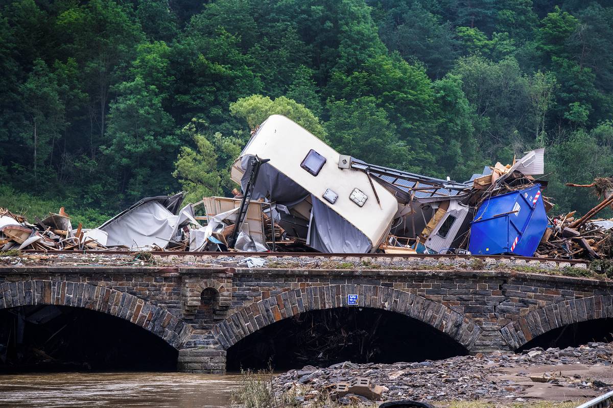 Poničený železniční most v Kreuzbergu zadržel karavany a chaty z kempu u řeky Ahr.