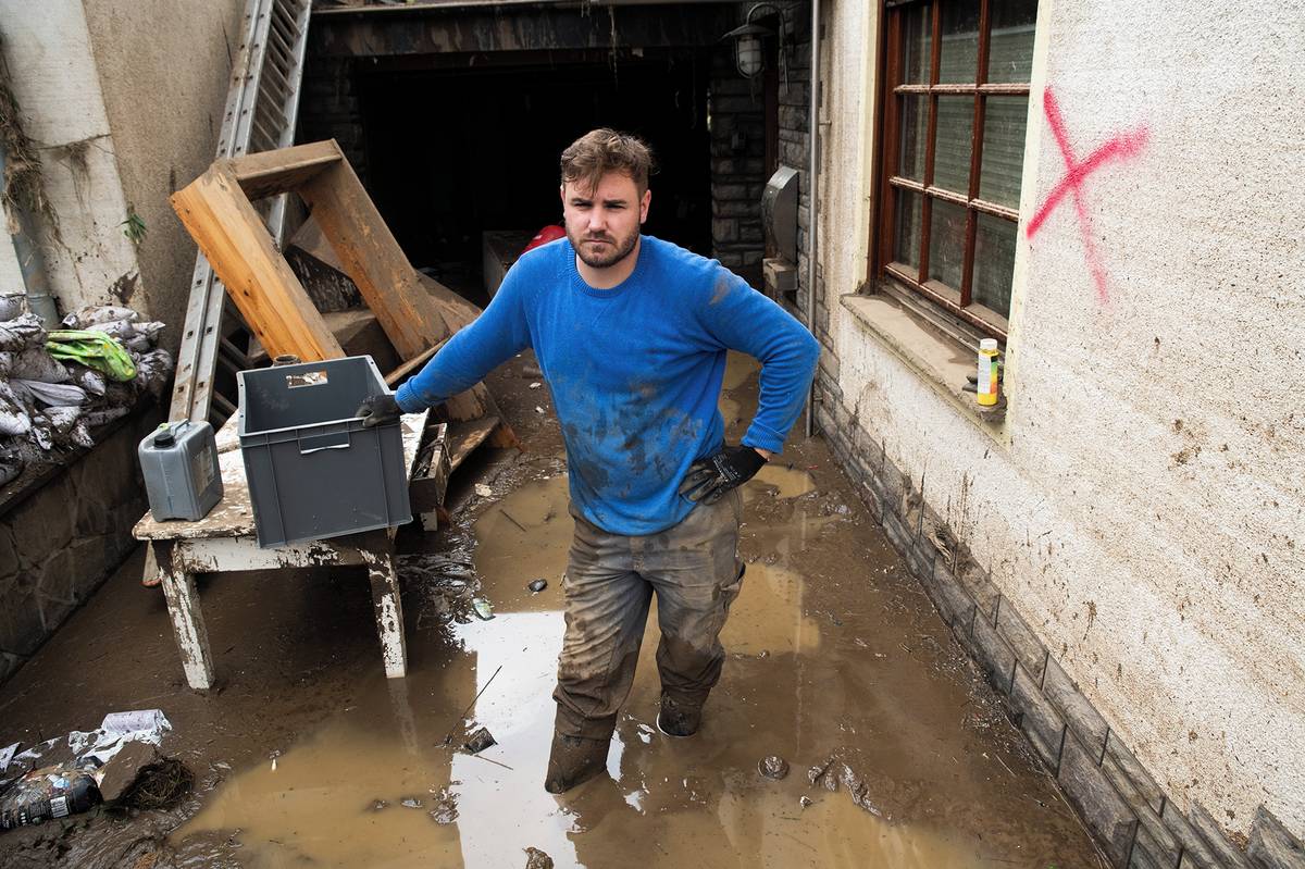 Christian odnáší ze svého domu věci, které voda nezničila.