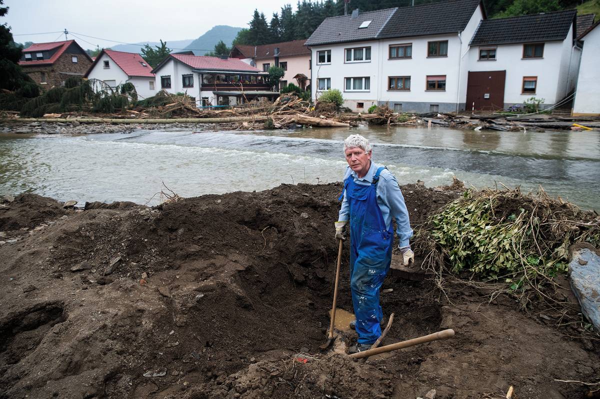 Hartmut Schneider v obci Kreuzberg se snaží vykopat pod nánosem bahna uzávěr plynu.
