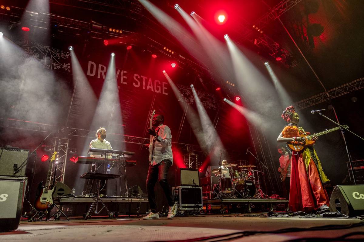 Vzadu jsou bubeník Jean-Baptiste Gbadoe a baskytarista Sekou Bah.