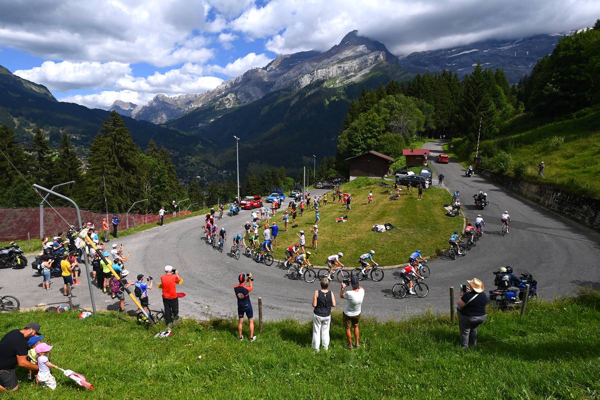 Celkový pohled na peloton projíždějící přes Col de la Croix (1 769 m) před jásajícími fanoušky během 9. etapy z Aigle do Châtel les portes du Soleil (1 299 m). Prakticky celá etapa vedla po území Švýcarska, teprve v závěru se peloton vrátil do Francie.