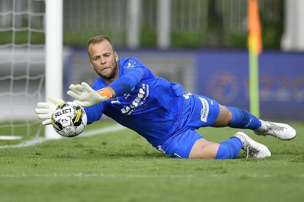 Brankář Roman Valeš z Bohemians zasahuje proti střele.