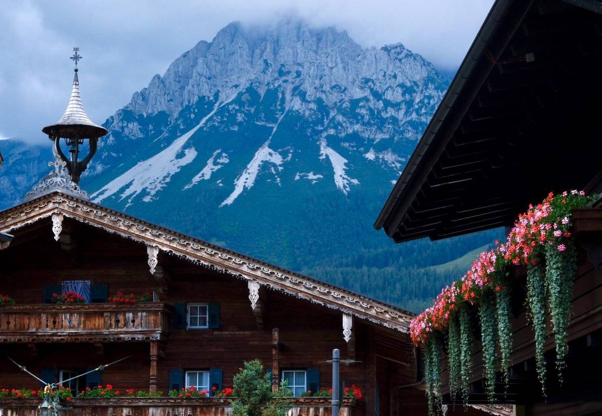 Pohled na horu se závojem v popředí krášlí malebné chaloupky v tradičním alpském stylu.