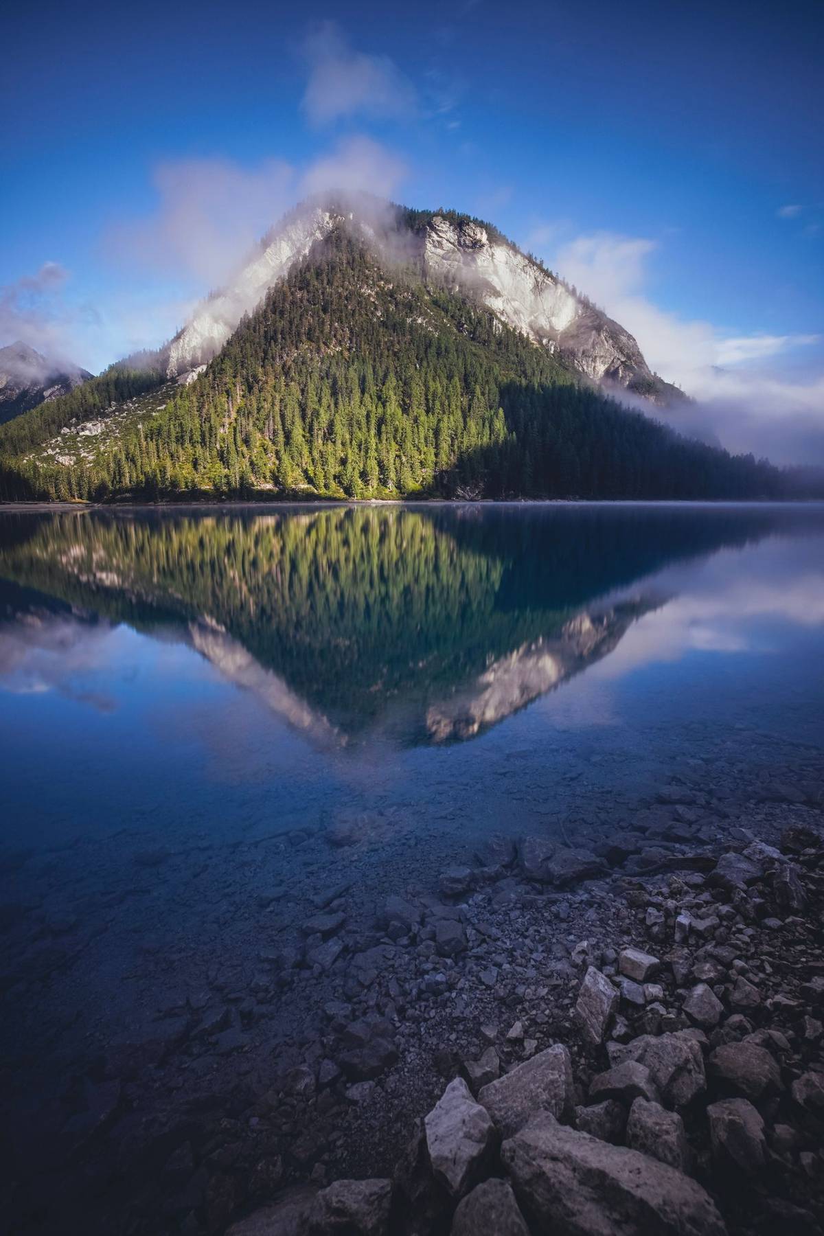 Stačí poodejít od kotviště loděk a blízkého hotelu a jezero máte rázem sami pro sebe. Procházka kolem celé vodní plochy se vyplatí, střídá se tu mírné stoupání a klesání a otevírají se krásné výhledy na téměř třítisícové hory.