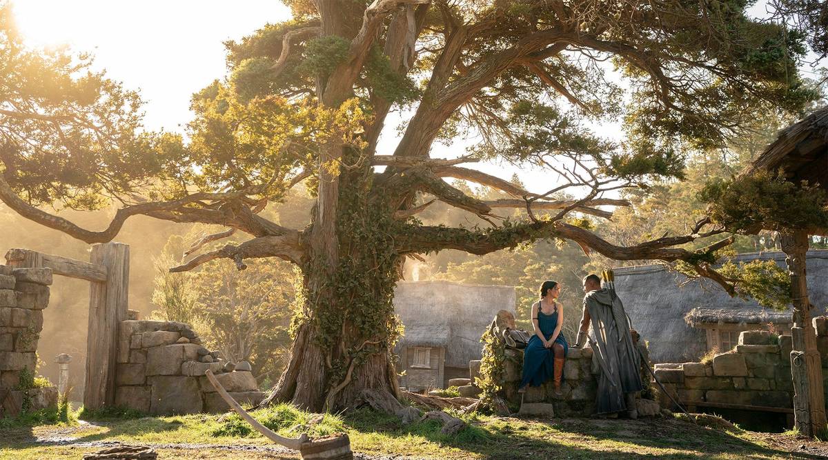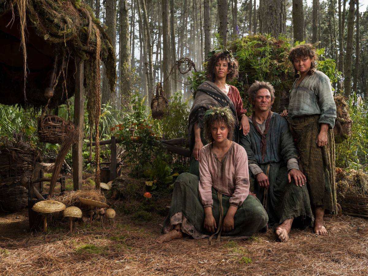 Vlevo je Morfydd Clarková jako Galadriel. V seriálu jako první vytuší, že do Středozemě se vrací zlo. Ještě však zbývá dlouho do chvíle, kdy Galadriel na východ od Mlžných hor, na březích řeky Anduiny, vybuduje chráněnou říši Lothlórien. Herečka Clarková řekla, že díky znalosti velštiny pro ni bylo jednodušší naučit se repliky, které má Galadriel v jazyce elfů.