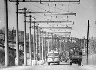 Pardubice vzápětí následovaly v zavedení trolejbusů Mariánské Lázně - v dubnu 1952. Nahradily tak opotřebený a dožívající tramvajový provoz. Trolejbusová trať v podstatě kopírovala trasu tramvaje a oproti ní byla navíc prodloužena do horní části města blokovou smyčkou okolo kolonády. (Na snímku výstavba trakčního vedení.)
