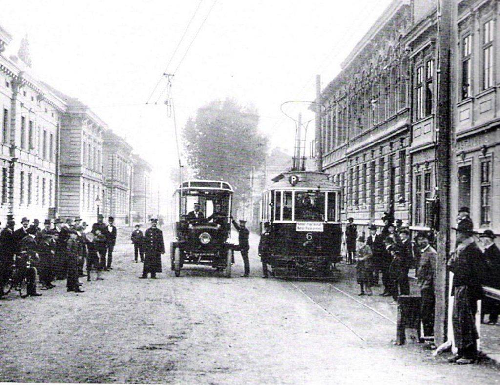 Trolejbus Daimler-Stoll (vlevo) v budějovických ulicích. Vpravo tramvaj Ringhoffer, 1909. Tehdejší trolejbusy byly nicméně značně nespolehlivé a po pěti letech, na počátku I. světové války, byl jejich provoz v Českých Budějovicích bez náhrady zastaven.