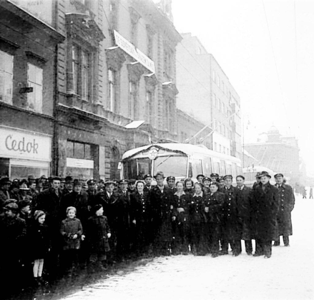 V Pardubicích se trolejbusy poprvé vydaly na trasu 20. ledna 1952. První linka vedla od starého nádraží přes střed města do Semtína a Bohdanče. Foto ze zahájení z archivu Dopravního podniku města Pardubic.