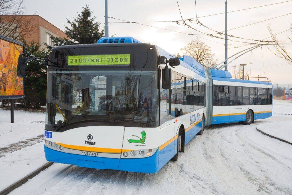 Solaris Trollino 15 v barvách ostravské MHD. Třínápravový nízkopodlažní trolejbus vyrábí od roku 2003 polskou firmou Solaris Bus & Coach.