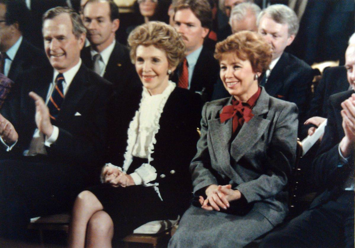 Raisa Gorbačovová, Nancy Reaganová a George Bush v roce 1987.