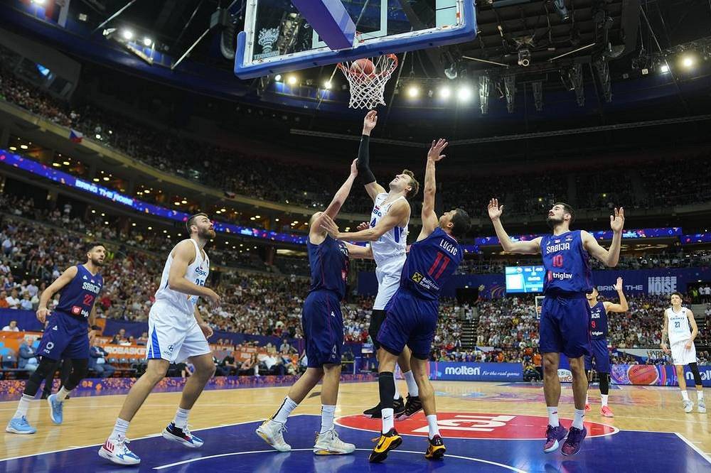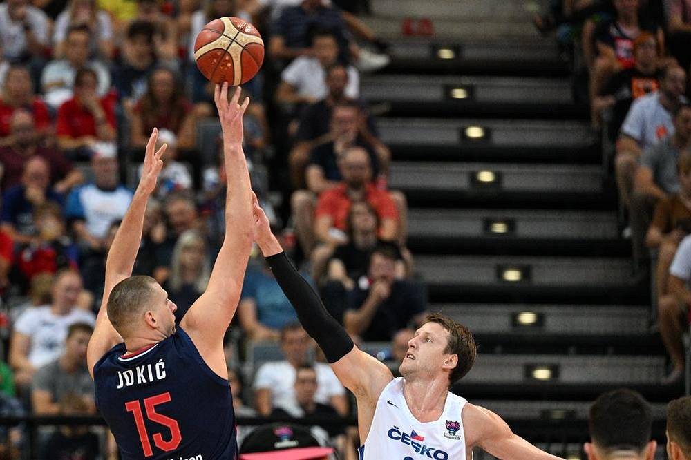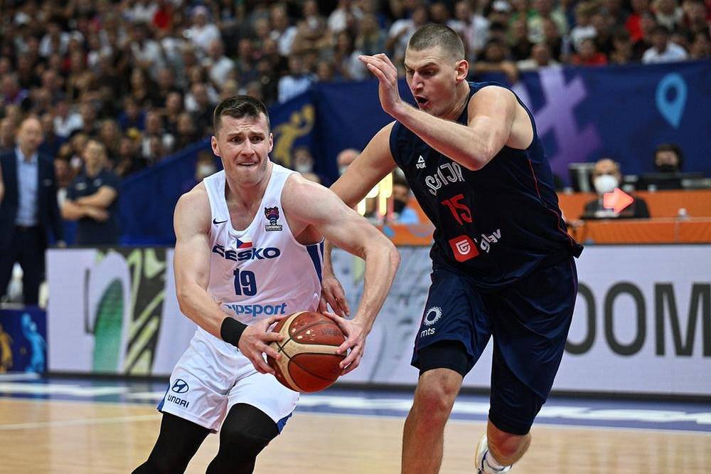 Srbská hvězda Nikola Jokič se probíjí českou obranou.