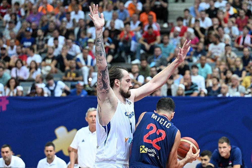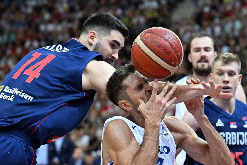 Ondřej Sehnal (vlevo) se snaží obejít Nikolu Jokiče.