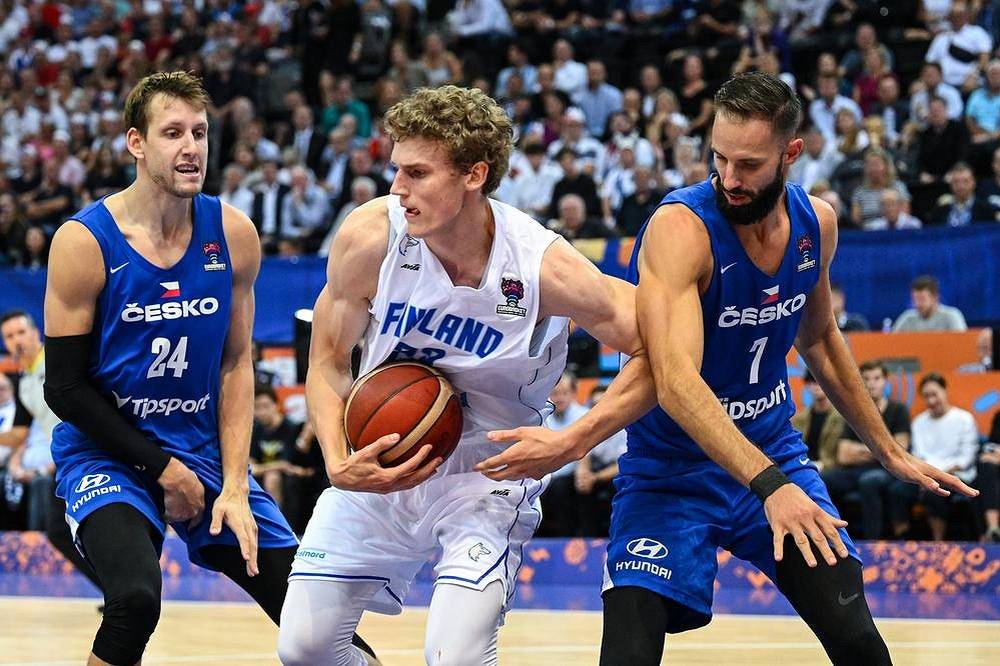 Vít Krejčí se snaží dostat míč do koše Finů.