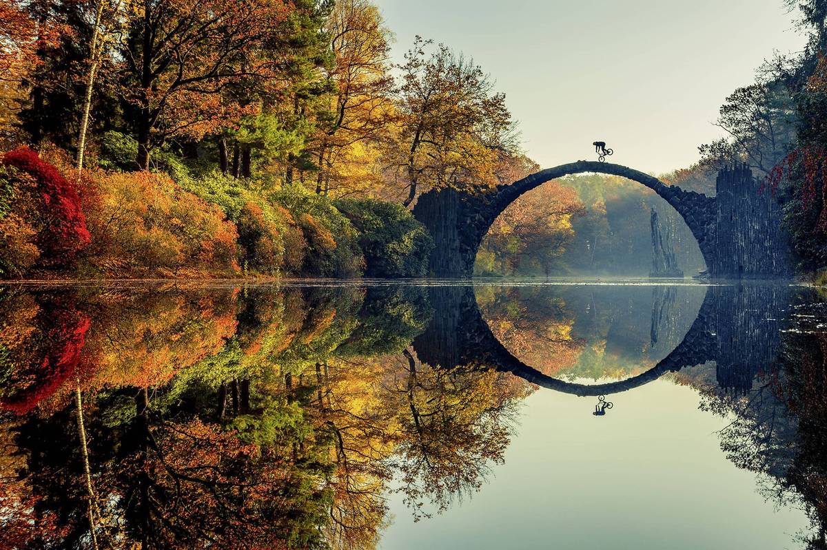 Lorenz Holder: Vítězný snímek z prestižní světové soutěže fotografů extrémních a menšinových Red Bull Illume Image Quest 2016. Fotografie zachycuje jezdce Senada Grosice na Ďáblově mostě u německé vesnice Kromlau.