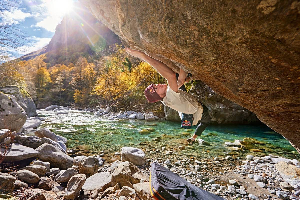 Stefan Kuerzi: Lezec Giuliano Cameroni překonává "Squalo bianco" ve švýcarském horském údolí Val Bavona.