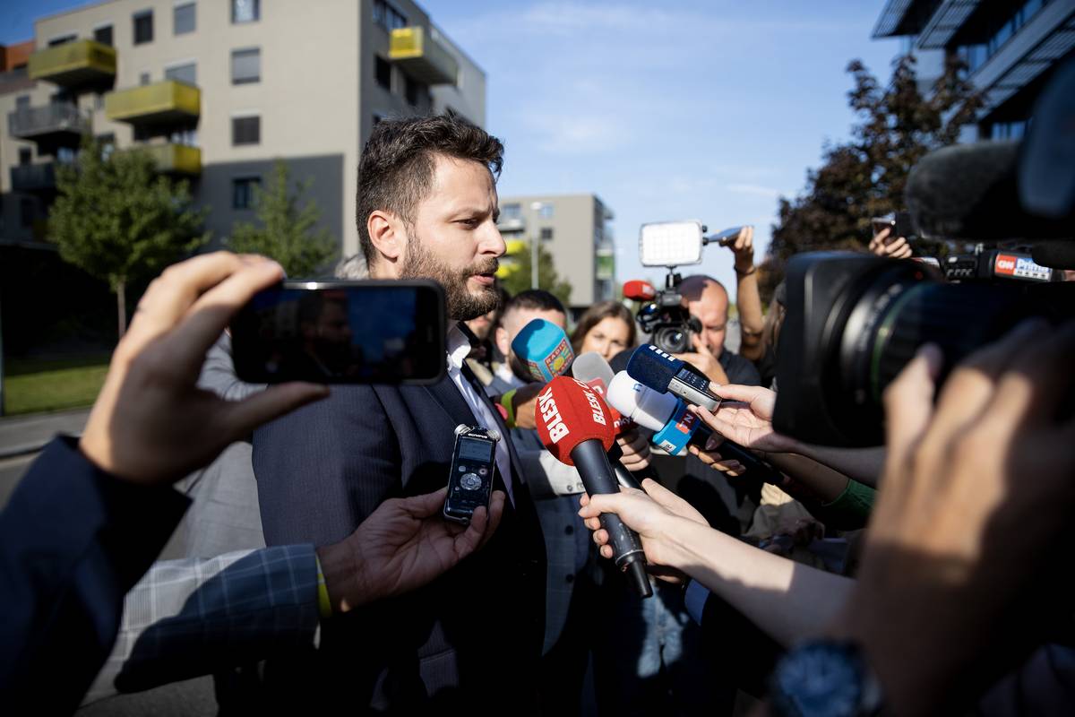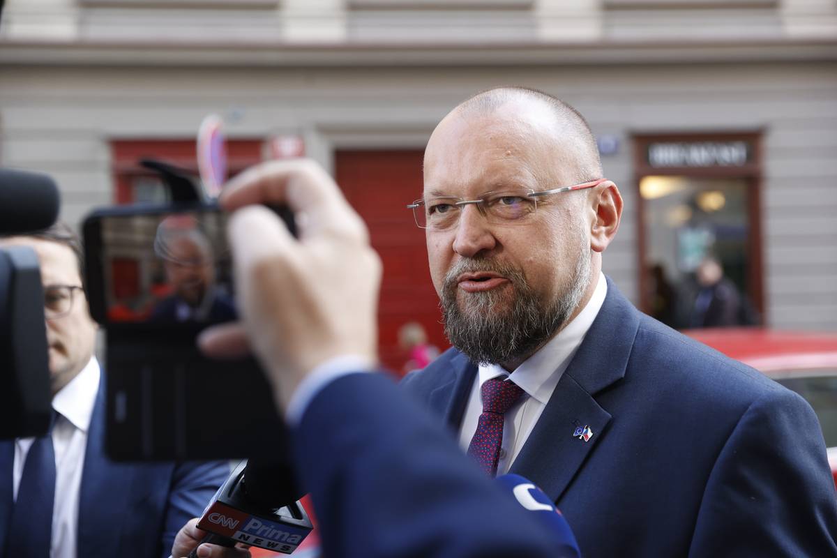 Ministr dopravy Martin Kupka z ODS před volebním štábem Spolu v Truhlářské ulici.