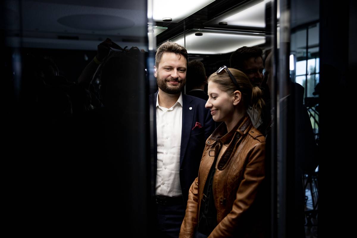 Ondřej Prokop z ANO se svou manželkou ve volebním štábu hnutí ANO.