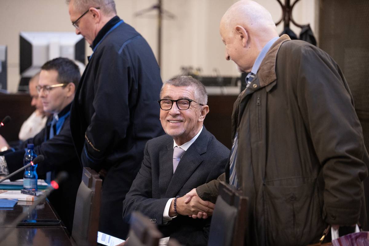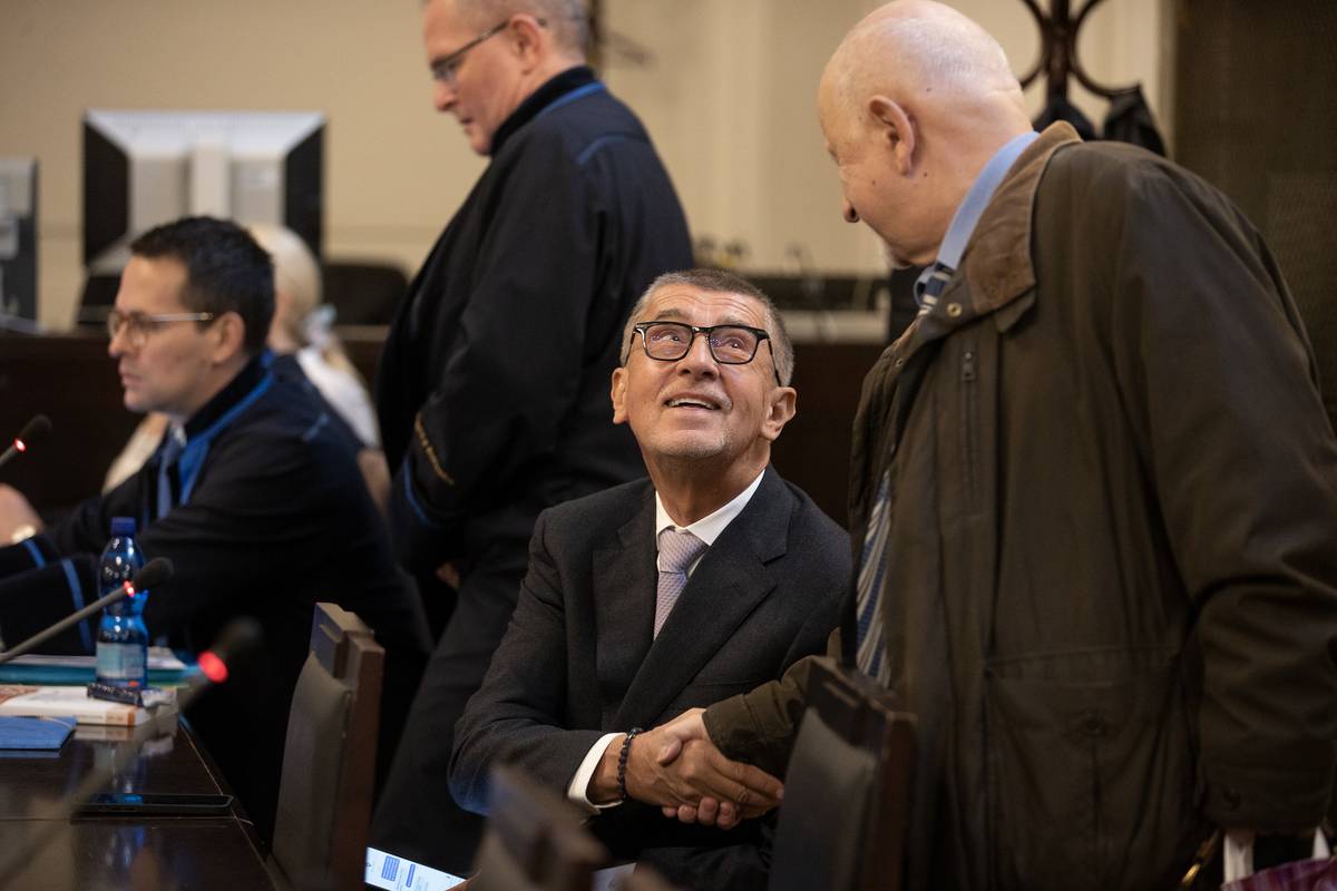 Babiš a manažerka Agrofertu Jana Mayerová (Nagyová) jsou obžalováni za dotační podvod a poškození zájmů EU při stavbě farmy Čapí hnízdo. Na snímku se Babiš zdraví se svým druhým advokátem Eduardem Brunou.