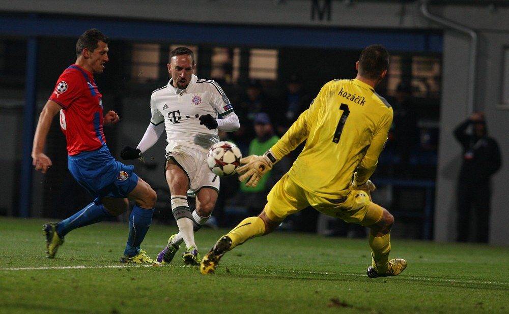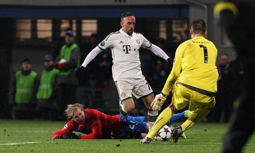 Franck Ribéry (v bílém) překonal ležícího Františka Rajtorala, ale plzeňského gólmana Matúše Kozáčika neprostřelil.