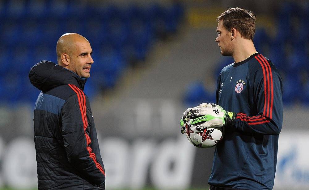 Brankář Bayernu Mnichov Manuel Neuer (vpravo) a trenér bavorského týmu Josep Guardiola při tréninku v Plzni.