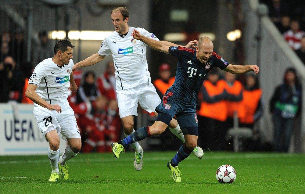 Plzeňský záložník Radim Řezník (druhý zprava) a Franck Ribéry z Bayernu v duelu Ligy mistrů.