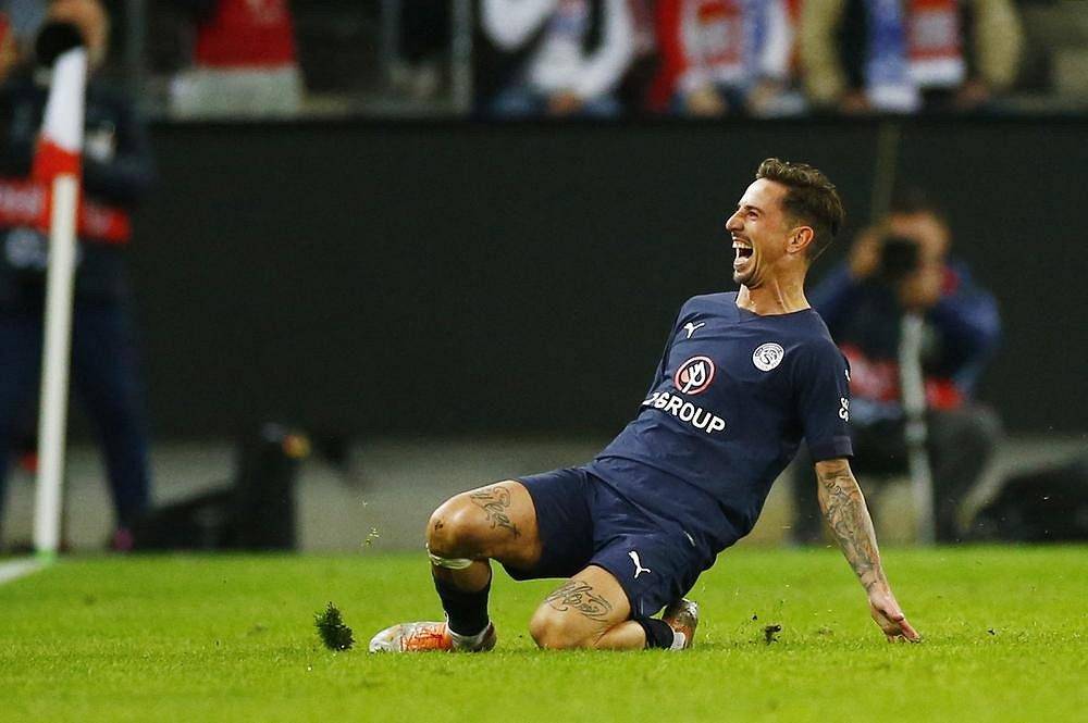 Oslava Milana Petržely po gólu vstřeleném na hřišti Kolína n. Rýnem.