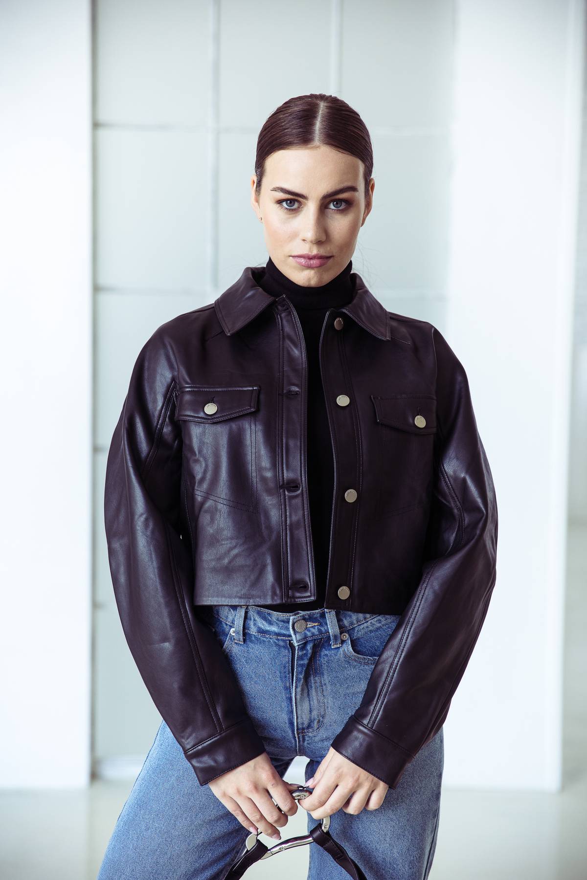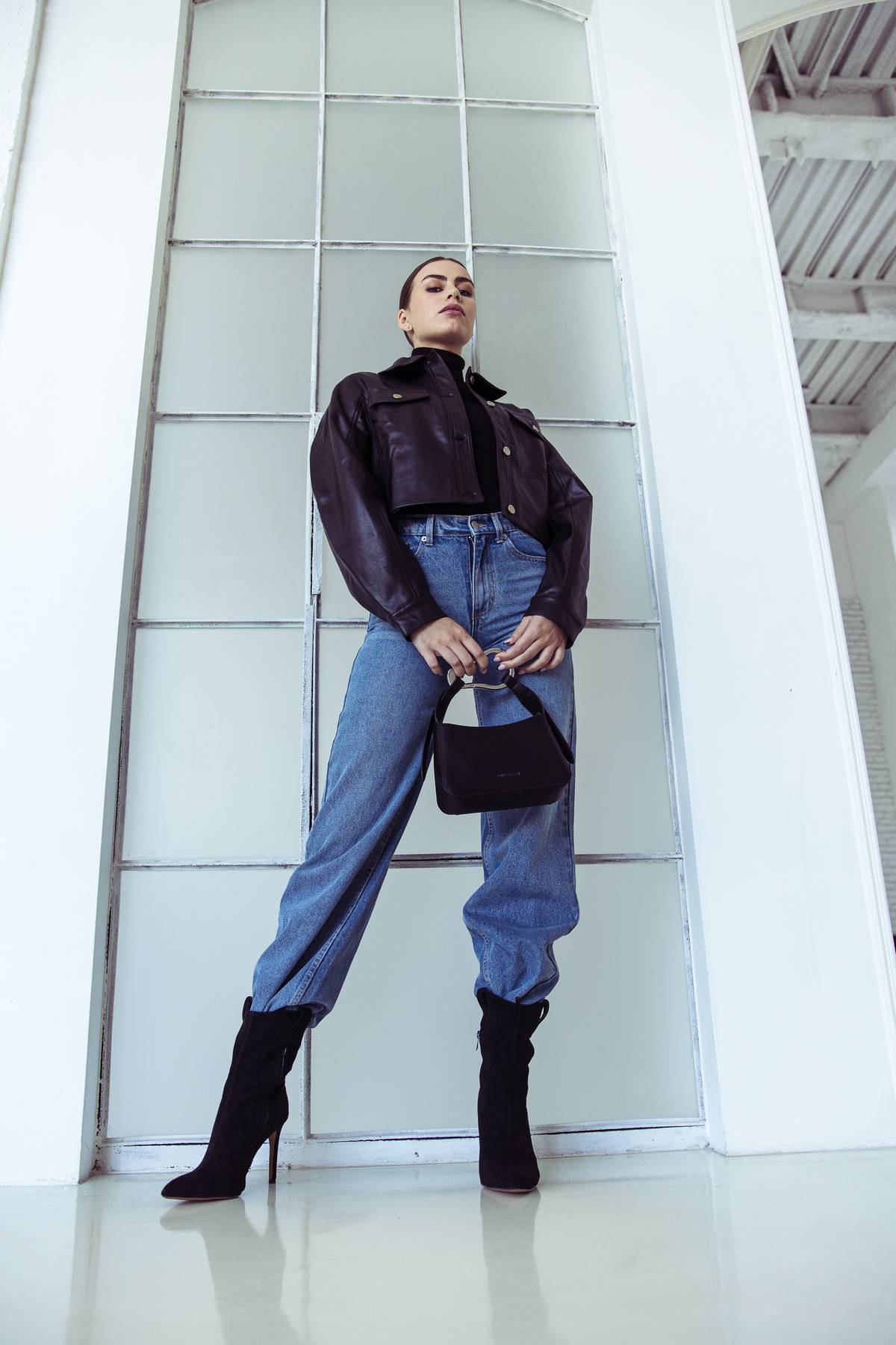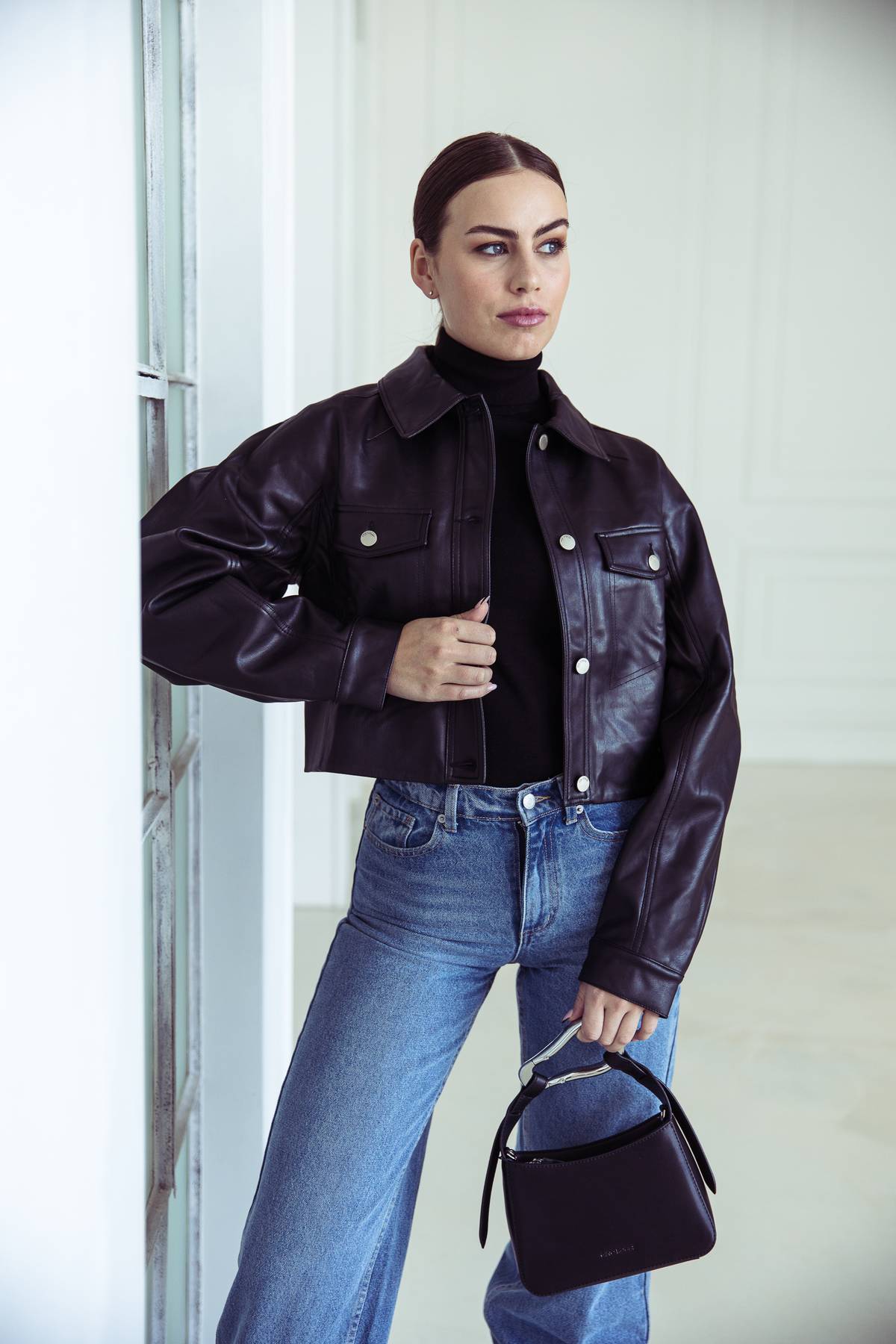 Džíny Edited, prodává Van Graaf, 1999 Kč; rolák Zara, 599 Kč; koženková bunda Mango, 1599 Kč; kožená kabelka Gino Rossi, prodává CCC, 2799 Kč; náušnice H&M, 399 Kč/set