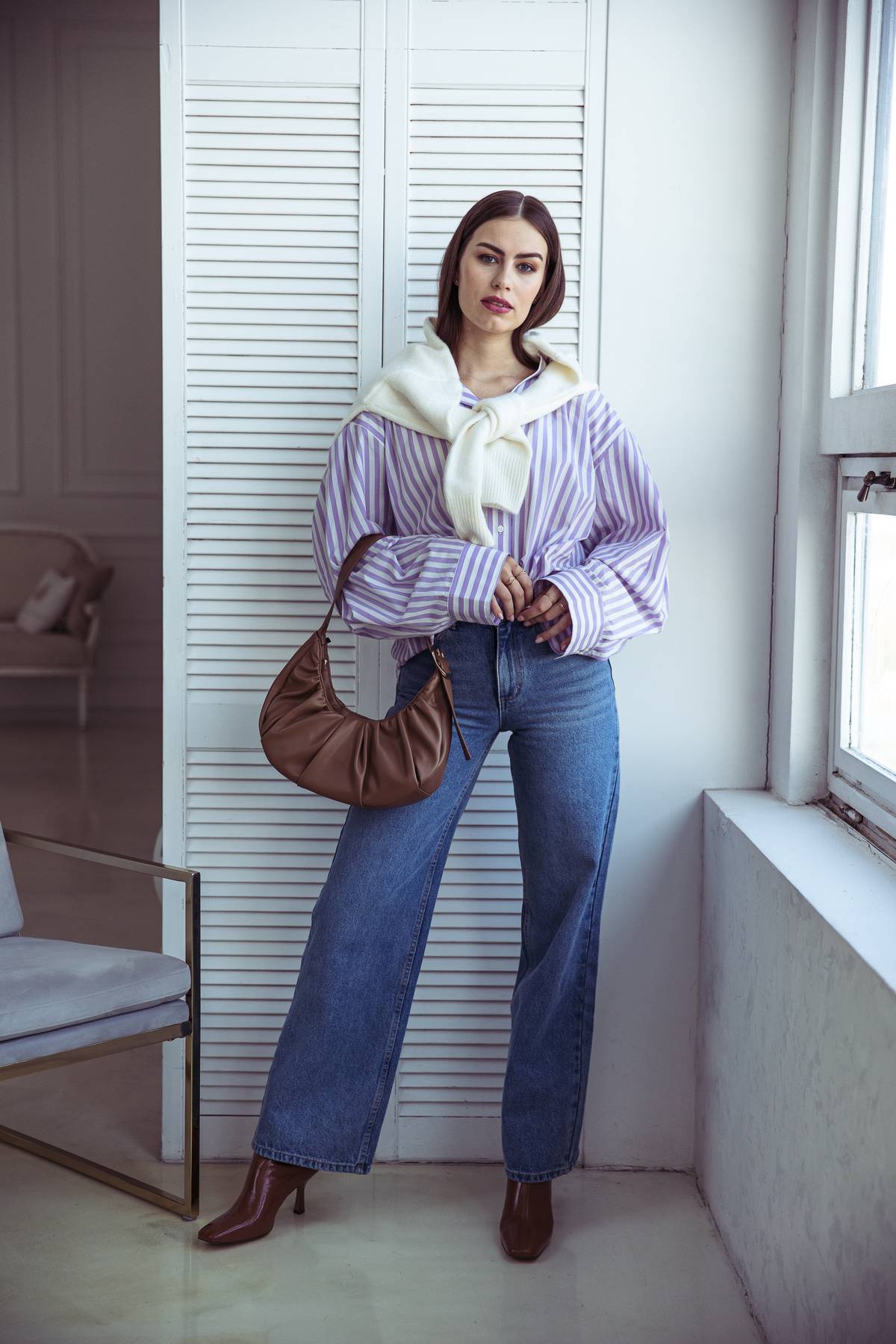 Džíny Edited, prodává Van Graaf, 1999 Kč; košile H&M, 899 Kč; svetr Reserved, 899 Kč; kabelka Jenny Fairy, prodává CCC, 1199 Kč; kožené boty Gino Rossi, prodává CCC, 2799 Kč; prsteny H&M, 349 Kč/set