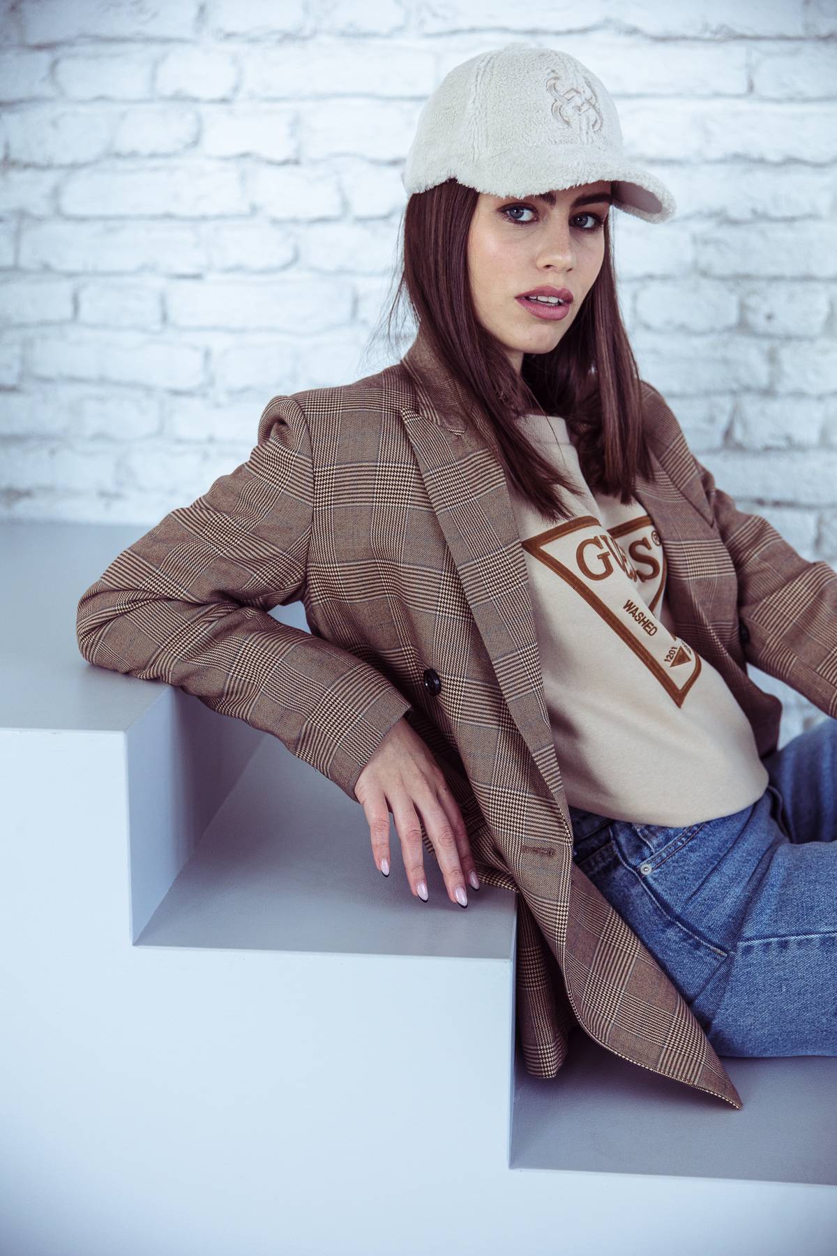 Džíny Edited, prodává Van Graaf, 1999 Kč; mikina Guess, prodává Van Graaf, 2499 Kč; sako Mango, 2299 Kč; kabelka Jenny Fairy, prodává CCC, 899 Kč; kšiltovka H&M, 399 Kč; kožené tenisky Gino Rossi, prodává CCC, 1899 Kč