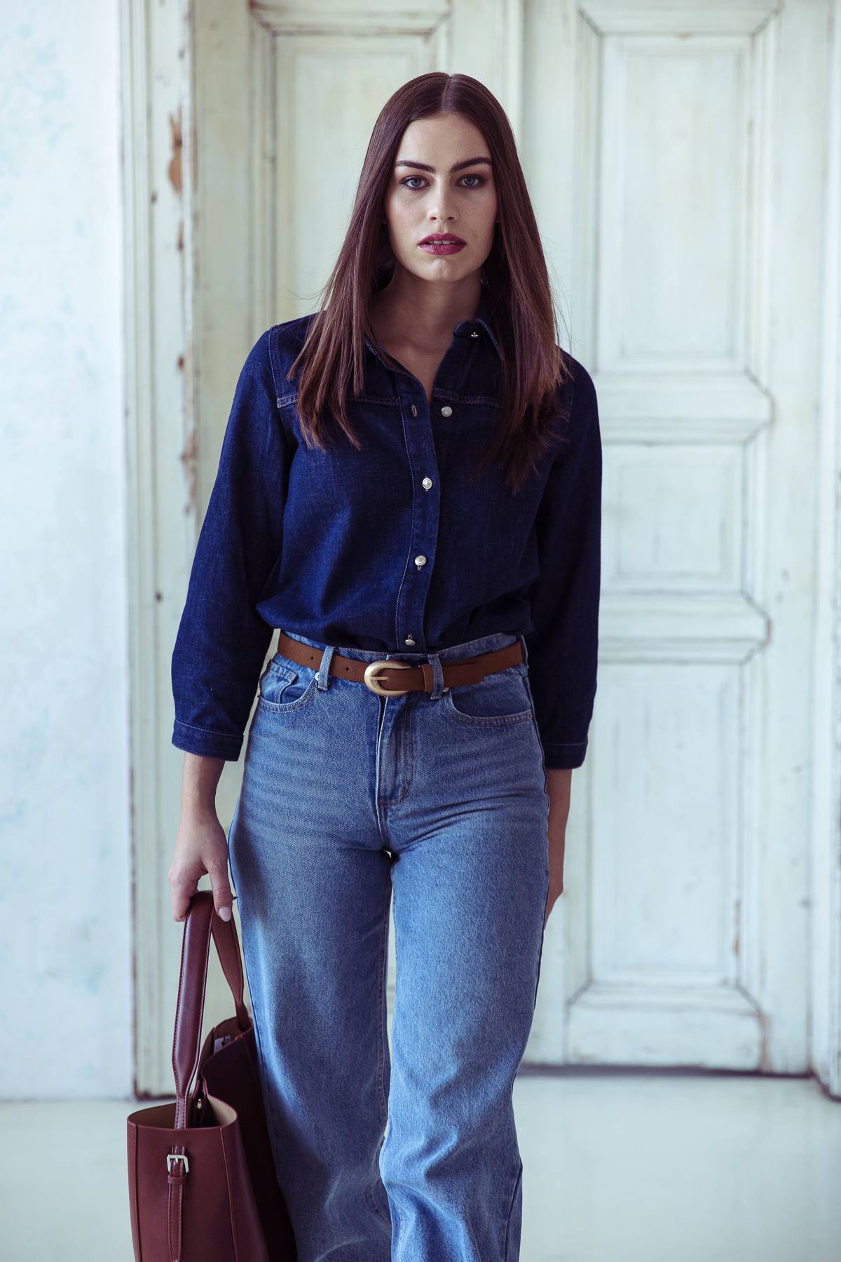 Džíny Edited, prodává Van Graaf, 1999 Kč; džínová košile Tommy Hilfiger, prodává Van Graaf, 3599 Kč; kabelka Mango, 1299 Kč; kožené boty Badura, prodává CCC, 2799 Kč; kožený pásek Mango, 599 Kč