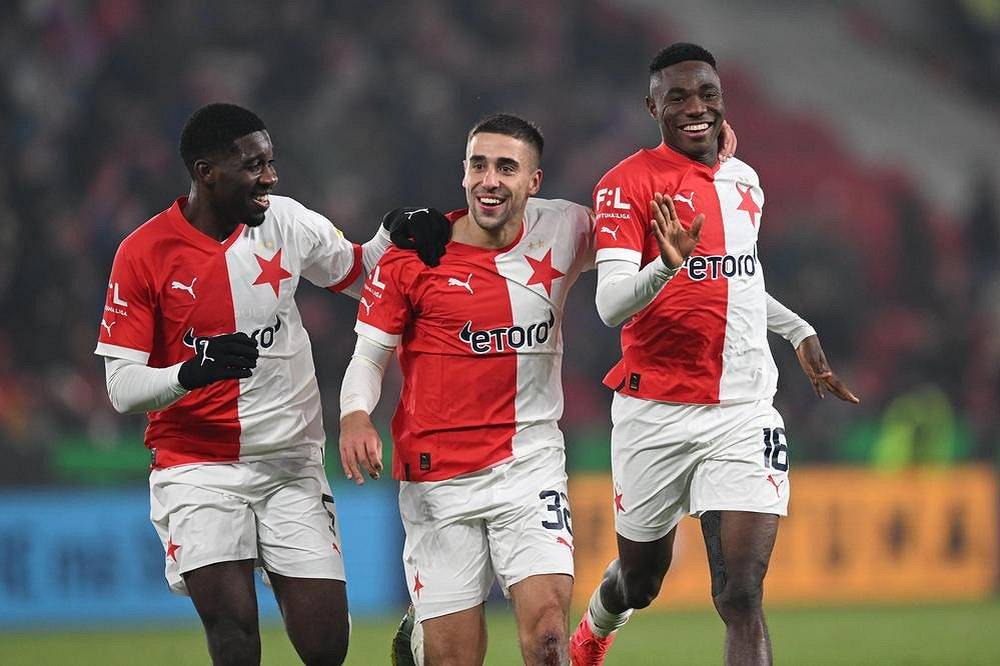 Matěj Jurásek ze Slavie Praha (uprostřed) oslavuje se spoluhráči svůj druhý gól během utkání s ostravským Baníkem.