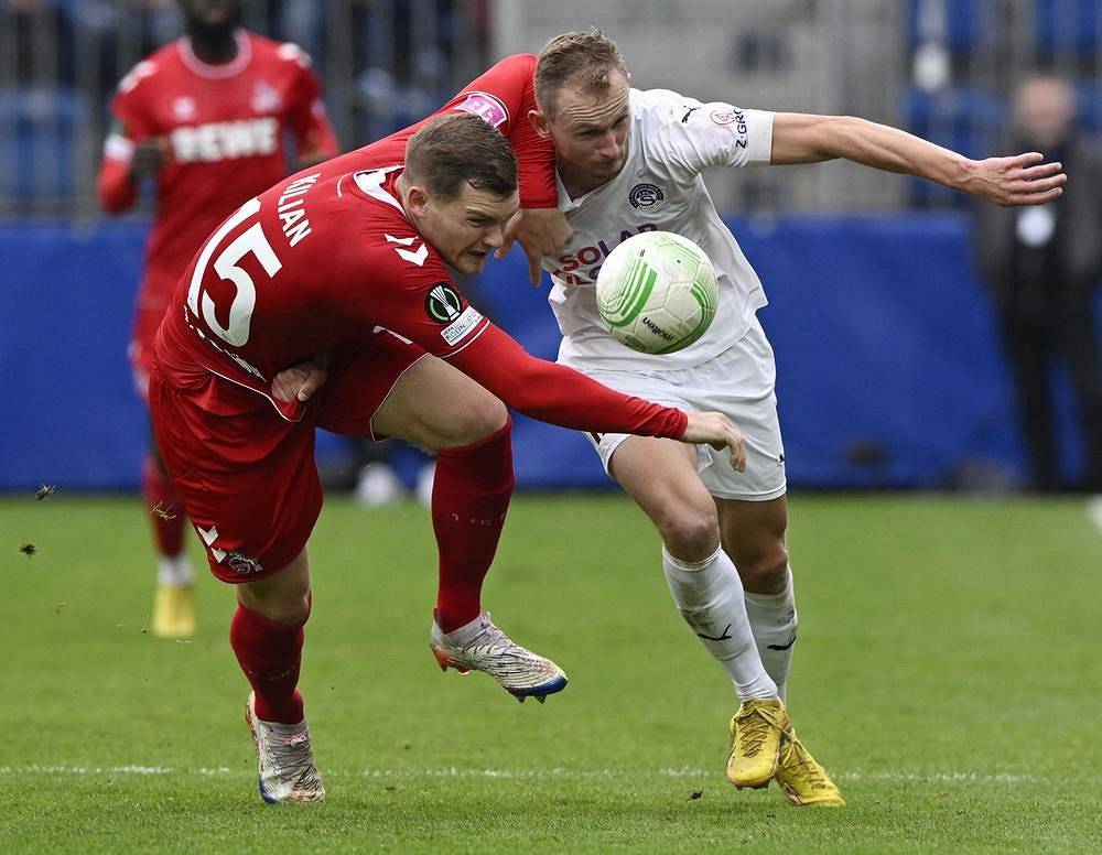 V tvrdém souboji o míč Luca Kilian (vlevo) z FC Köln a Ondrej Mihálik ze Slovácka.