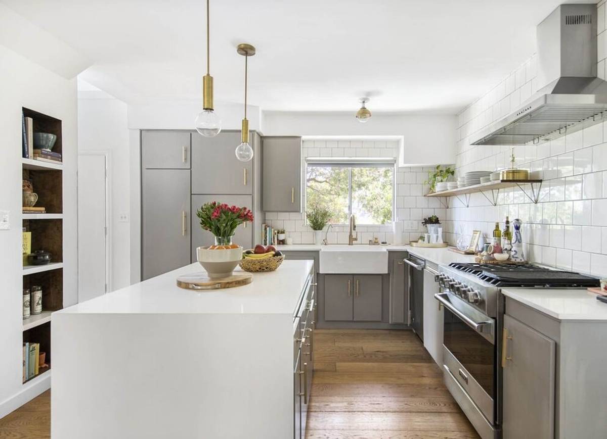 Všudypřítomnou bílou výmalbu v kuchyni doplňuje šedá barva, na niž lze v domě také hojně narazit.