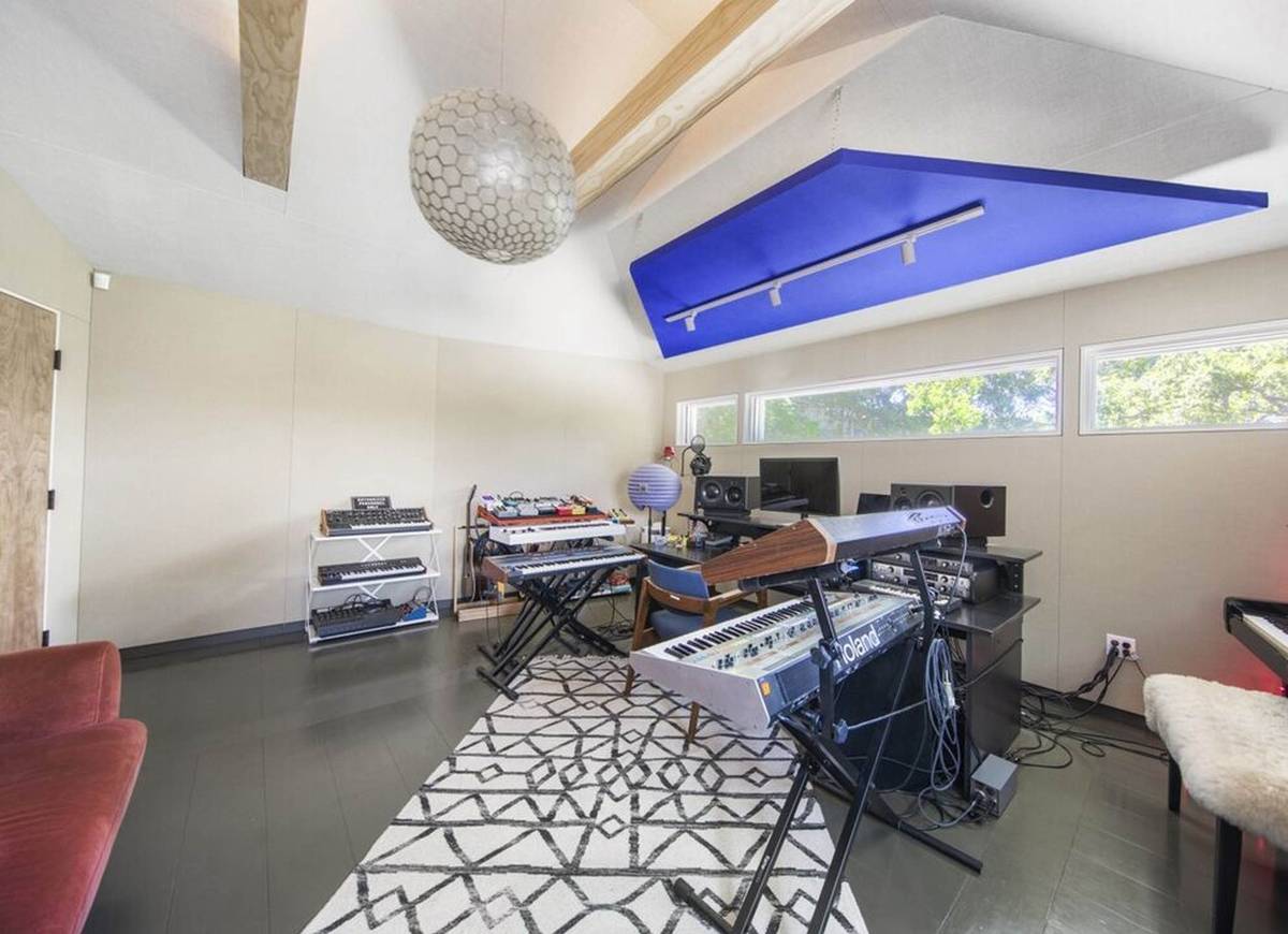 Šedomodrý dům má zajímavý tvar, v patře je větší než v přízemí.