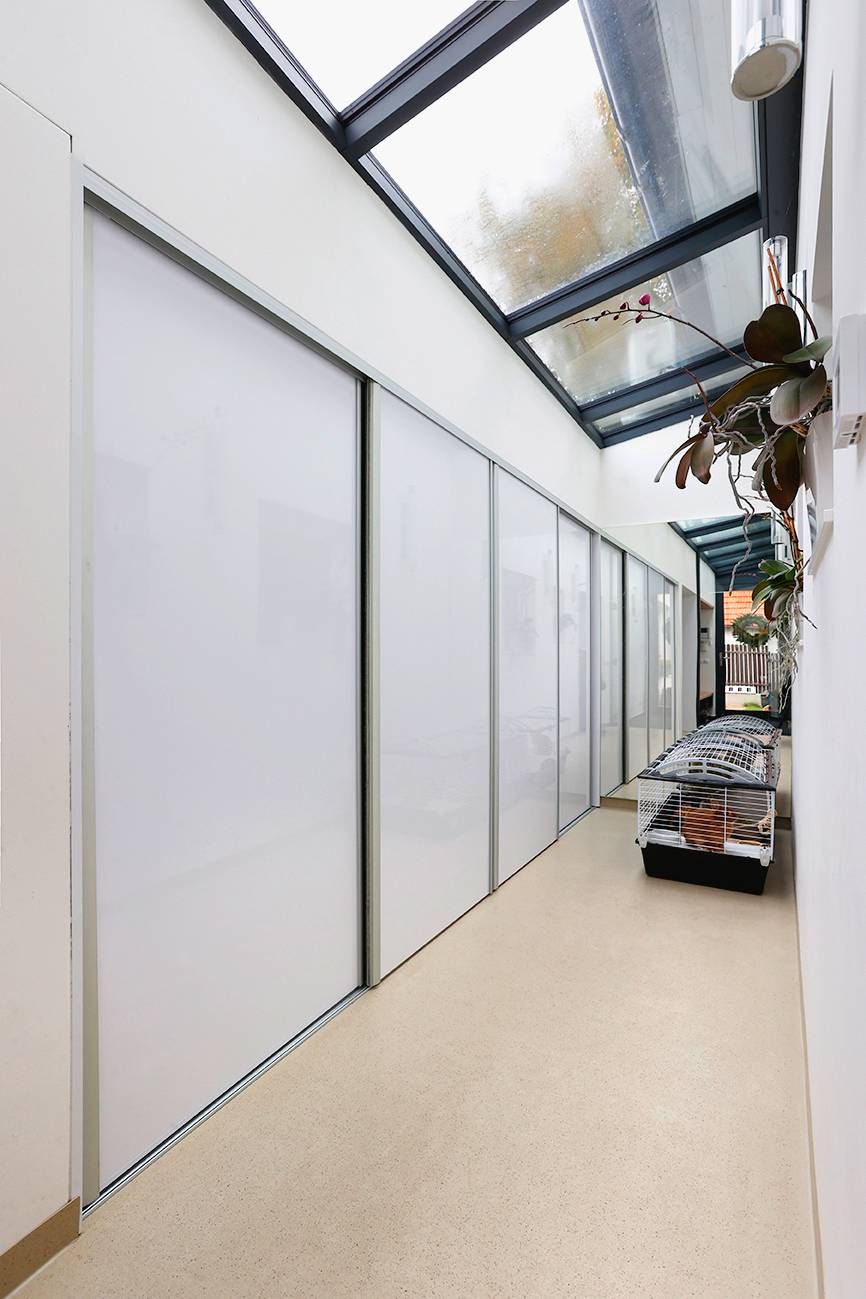 Vstup do domu ústí do dlouhé chodba se skleněným stropem a stěnou skrývající vestavěné skříně.
