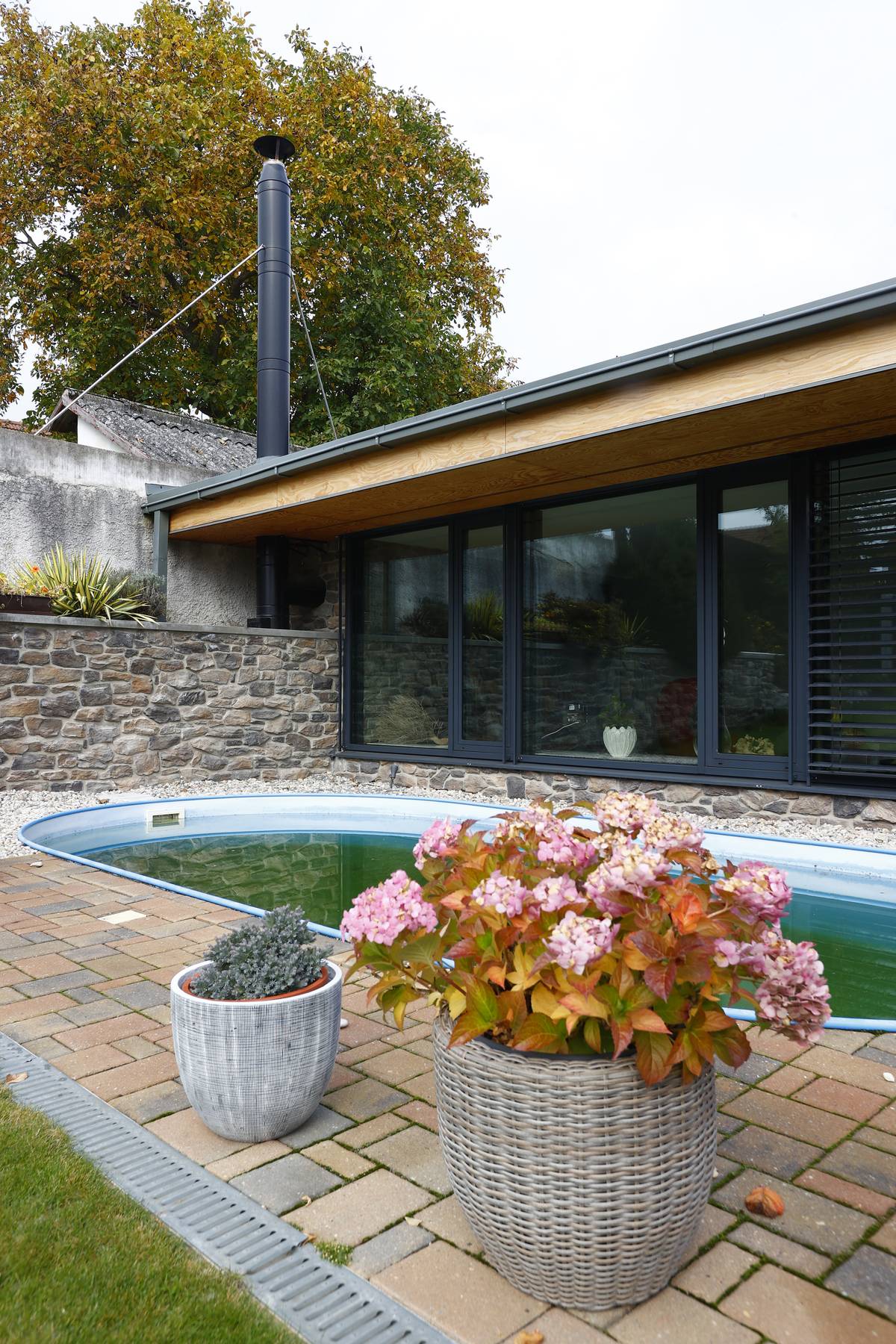 Zimní zahrada (ve skutečnosti obývací pokoj s krbem) mají výhled na terasu s bazénem.