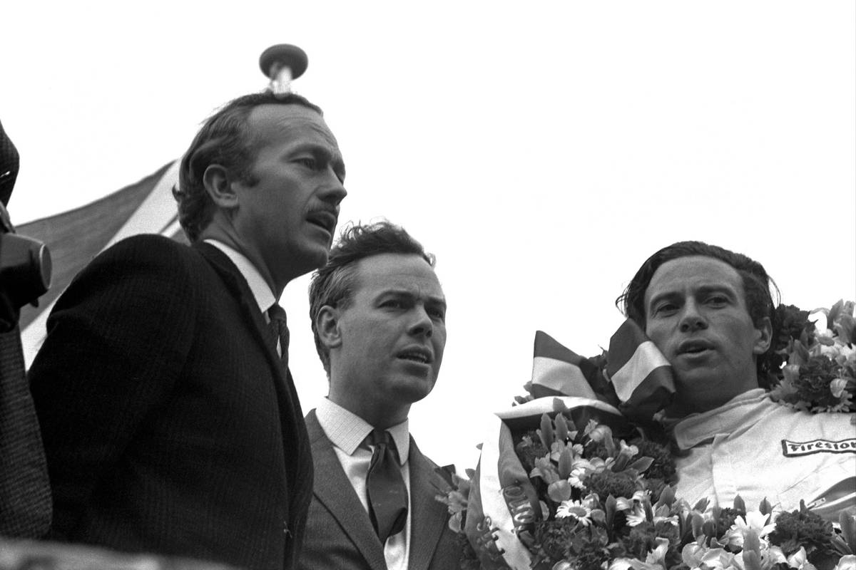 Po triumfu v nizozemském Zandvoortu 1967 zleva Keith Duckworth (spoluzakladatel Cosworthu), Colin Chapman a Jim Clark