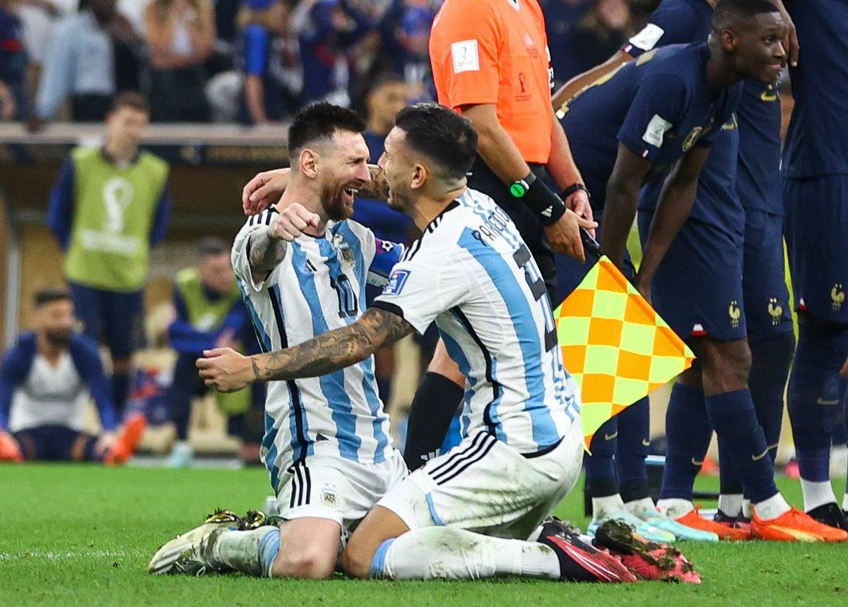 DOBOJOVÁNO. Lionel Messi a Leandro Paredes oslavují titul mistrů světa, který získali pro tým Argentiny ve finálovém střetnutí s Francií.
